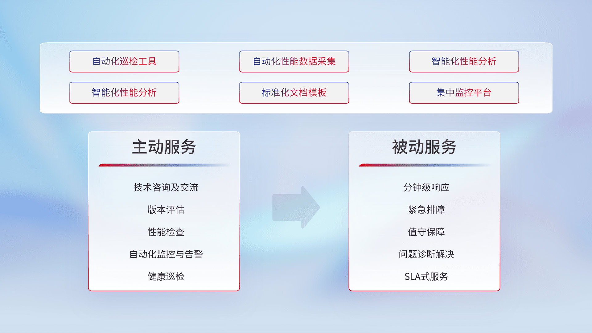 智能化工具和标准化文档,,保障服务质量,,,提供主动服务(包含技术咨询、、、版本评估、、、性能检查、、自动化监控与告警、、健康巡检)和被动服务包含(分钟级响应、、、紧急排障、、、值守保障、、、问题诊断解决、、、、SLA服务)。。